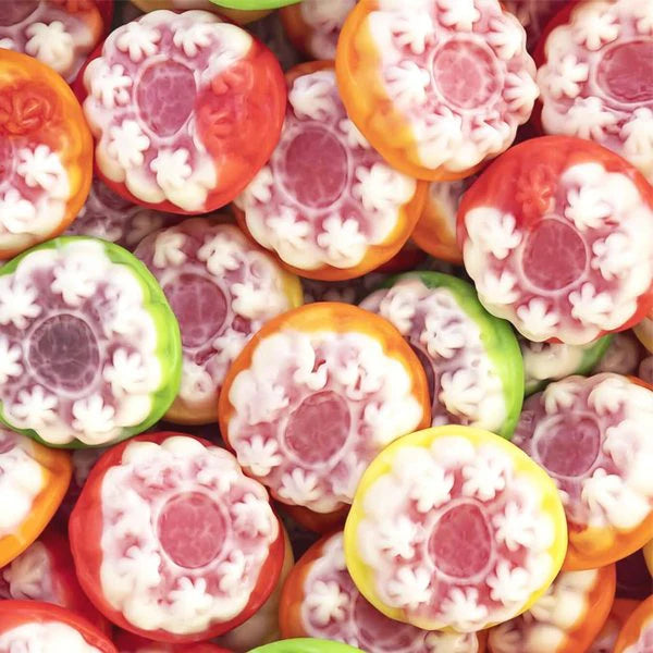 Glucose syrup, sugar, beef and pork gelatine, humectant: sorbitols; acids: lactic acid, citric acid; corn starch, invert sugar syrup, gelling agent: pectins; flavourings, acidity regulator: sodium citrates; vegetable oils: palm; glazing agents: carnauba wax, beeswax; colours: E102, E129, E133.