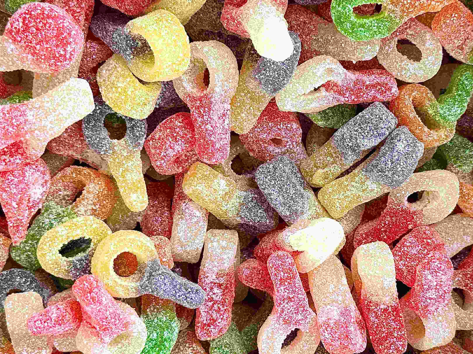 Sugar, Glucose Syrup, Corn Starch, Water, Acids (Citric Acid, Malic Acid), Acidity Regulator (E331), Flavourings, Colours (E102, E129, E133).